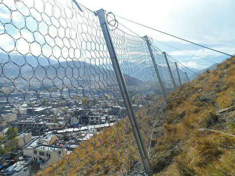 被動防護網(wǎng)統(tǒng)是將以菱形鋼絲繩網(wǎng)或環(huán)形網(wǎng)為主的柔性柵欄設(shè)置于斜坡上一定位置,用于攔截斜坡上的滾落石(或落物)以避免其破壞擬保護的對象,因此也稱為攔石網(wǎng):當設(shè)置于泥石流區(qū)內(nèi)時,便可形成攔截泥石流體內(nèi)固體大顆粒的柔性格柵壩。